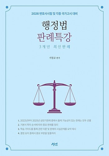 변호사시험을 포함한 각종 국가고시에서 출제 문제의 중요 자료가 판례라는 점은 주지의 사실이다. 따라서 고득점 합격을 하기 위해서는 판례의 입장을 정확히 이해해야 한다. 그런데 최근 판례는 익숙지 않은 관계로 수험생들이 자신의 것으로 완벽히 소화하여 시험장에서 답안지로 현출하는데 일정한 한계가 있다. 이 점을 고려하여 최근 대법원 중요판례를 효율적으로 학습하여 정리하는데 도움을 주기 위해 「행정법 최근 3개년 판례특강」을 집필하게 되었다. 본 교재를 통하여 최근 행정법의 중요 쟁점이 무엇인지를 파악하고, 이를 바탕으로 출제될 쟁점을 가늠해 볼 수 있을 것이다.