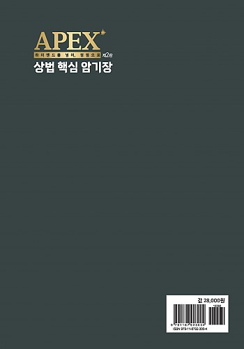 ‘High-End 교재’를 시리즈로 출간하면서 선택형, 사례형 교재와 헷갈리지 않도록 본 암기장은 올해부터 교재명을 ‘APEX 상법 핵심 암기장’으로 출간하게 되었습니다.